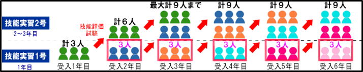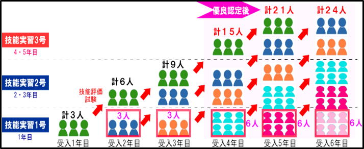 ※優良基準適合者に認定されるには実習生の技術習得に係る 実績等が必要です。 ※1号実習生の人数は常勤職員の総数を超えてはならない。 ※2号実習生の人数は常勤職員の総数の2倍を超えてはならない。 ※3号実習生の人数は常勤職員の総数の3倍を超えてはならない。 ※技能実習2号から技能実習3号へ移行する前に1か月以上の一時 帰国が必要です。 |